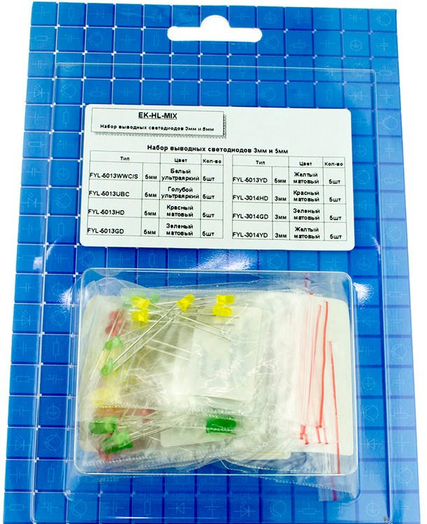 EK-HL-MIX, Набор выводных светодиодов 3мм и 5мм (3мм — 3 цвета по 5шт, 5мм — 5 цветов по 5шт)